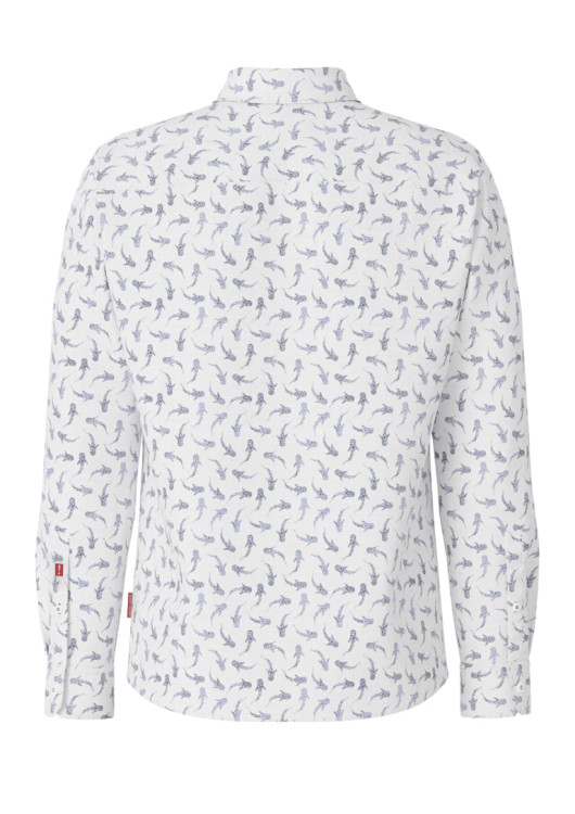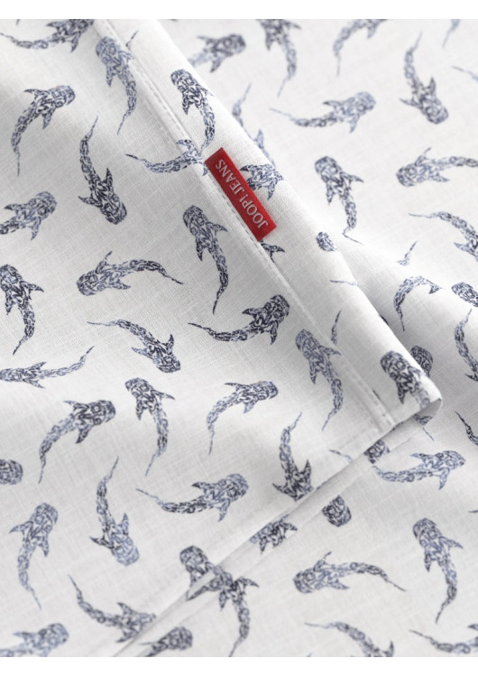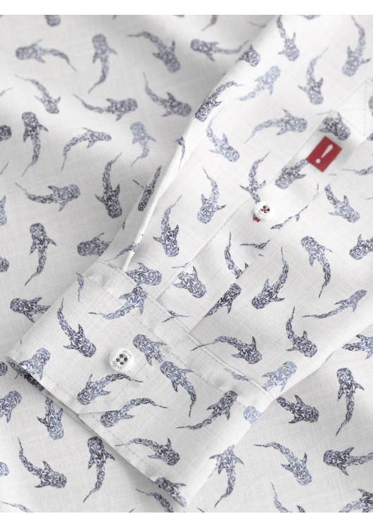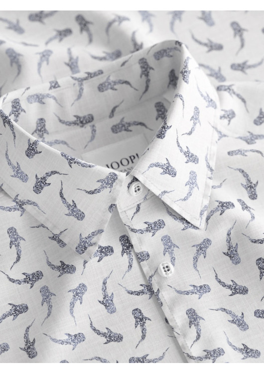 Oživte svůj šatník s touto originální a vysoce elegantní košilí od prestižní značky JOOP! JEANS. Zářivě bílý podklad zdobí celoplošný tmavě modrý potisk s motivem žraloků, který dodává tomuto kousku nezaměnitelný letní a sebevědomý charakter. I přes výraznější vzor si košile zachovává maximální vkus a úroveň.