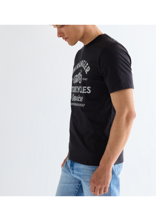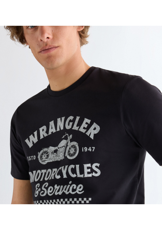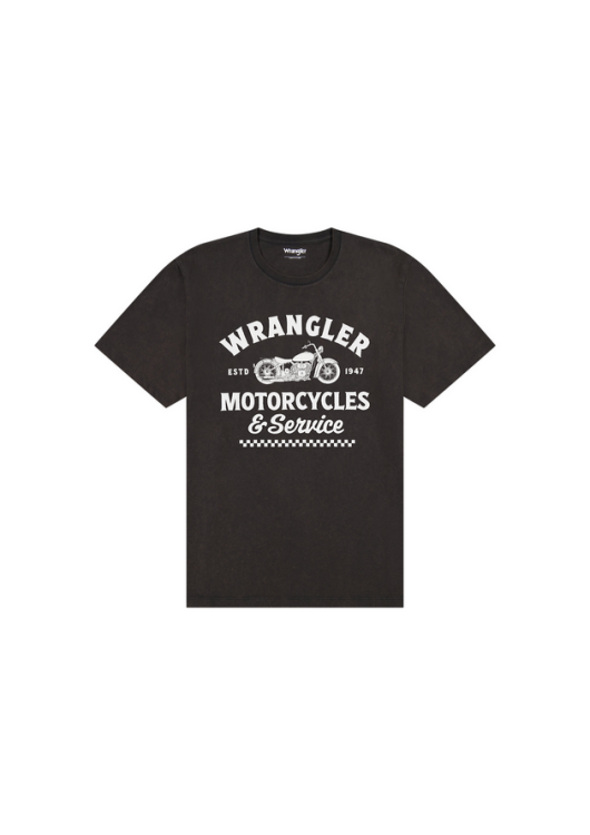 Milujete vůni benzínu, svobodu na dvou kolech nebo prostě jen poctivý vintage styl? Toto pánské tričko od legendární značky Wrangler nesmí chybět ve vašem šatníku. Klasický černý základ zdobí na hrudi výrazný bílý potisk s retro motivem motocyklu, šachovnicovým vzorem a nápisem. Odkazuje tak na bohaté dědictví a rebelského ducha této americké značky.