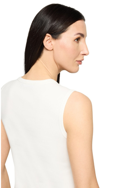 Hlavním designovým detailem je kamínková aplikace ve tvaru loga, která topu dodává jemný záblesk luxusu, aniž by působila okázale. Je to kousek stvořený pro ženu, která oceňuje kvalitu přírodního materiálu a hledá kousek, který s lehkostí doplní sako do kanceláře nebo kardigan pro volný čas. Top, který díky elastanu perfektně sedí a zajistí vám pocit sebevědomí v každé situaci.