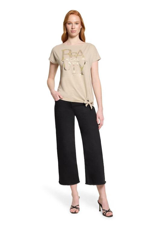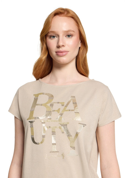 Hledáte vršek, který je stejně pohodlný jako triko, ale vypadá mnohem sofistikovaněji? Toto triko od prestižní značky Betty Barclay přináší do vašeho šatníku světlo a pozitivní energii. Béžová barva s metalickým odleskem okamžitě prozáří váš obličej, zatímco nápis podtrhuje vaši přirozenou krásu.