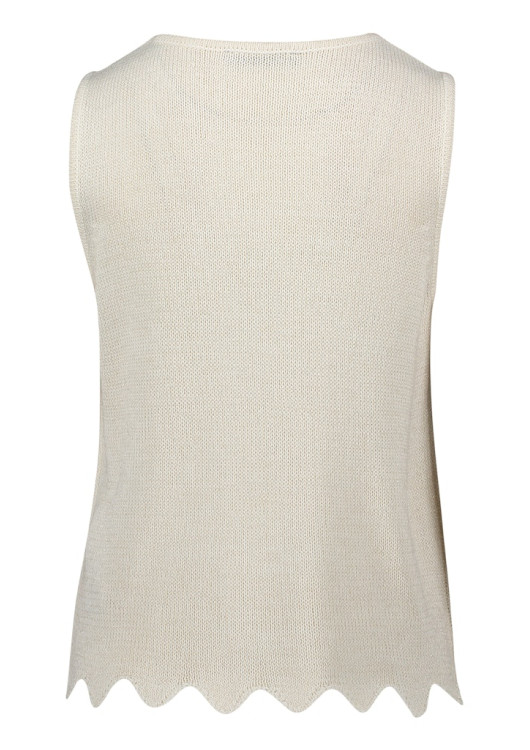 Hlavním designovým detailem je hravé zakončení spodního okraje do vlnek, které topu dodává romantický charakter. Je to kousek stvořený pro ženu, která miluje vrstvení – skvěle vypadá pod sáčkem, ale díky preciznímu zpracování průramků a kulatému výstřihu zazáří i samostatně. Top, který s lehkostí propojí vaši eleganci s každodenním komfortem.