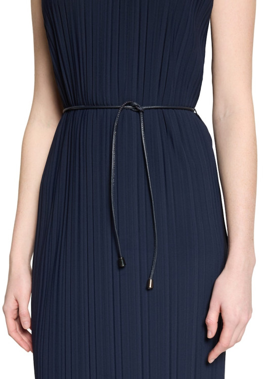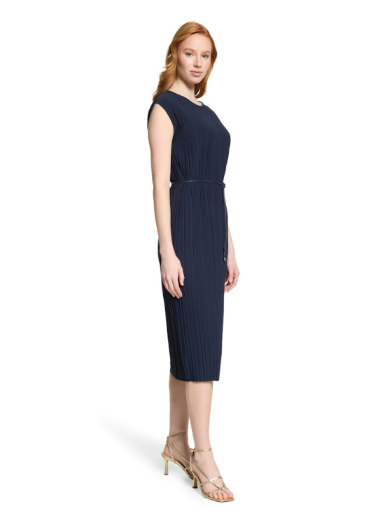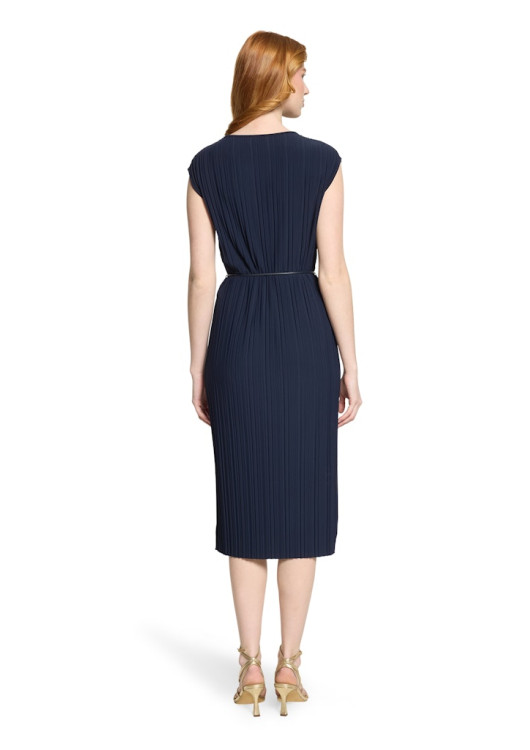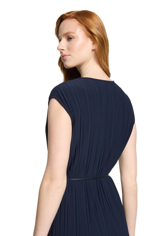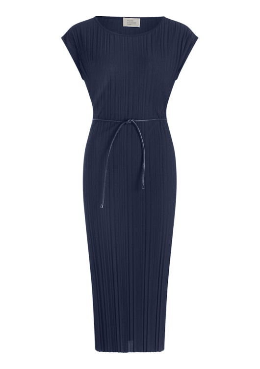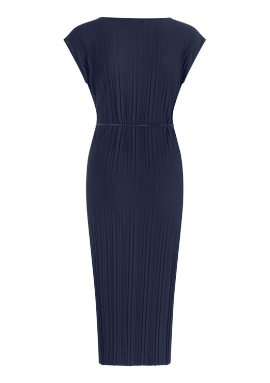 Šaty mají jednoduchý kulatý výstřih a prodlouženou ramenní linii, která lichotivě kryje ramena. Součástí je také tenký, elegantní vázací pásek s kovovými koncovkami, kterým si můžete šaty stáhnout v pase a vytvořit tak perfektní ženskou siluetu. Díky inovativnímu syntetickému materiálu s elastanem jsou šaty navíc absolutně bezúdržbové – nemačkají se a své ostré záhyby si udrží navždy. Skvěle se hodí do divadla, na svatbu, ale i na důležitou pracovní schůzku.
