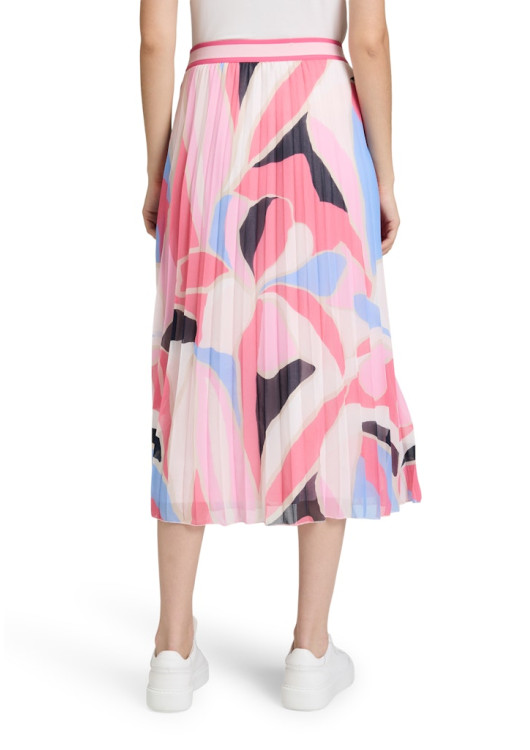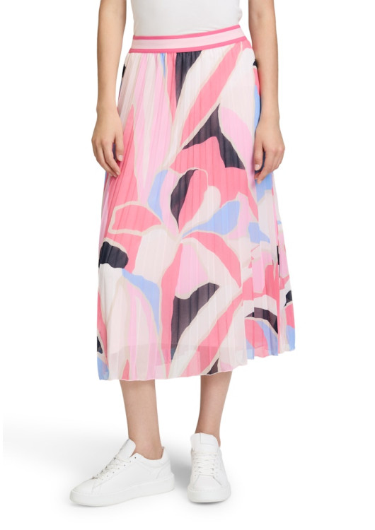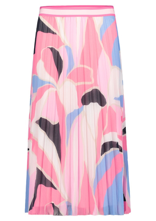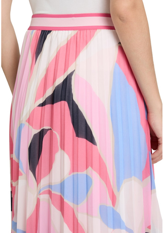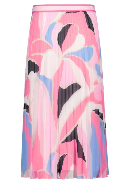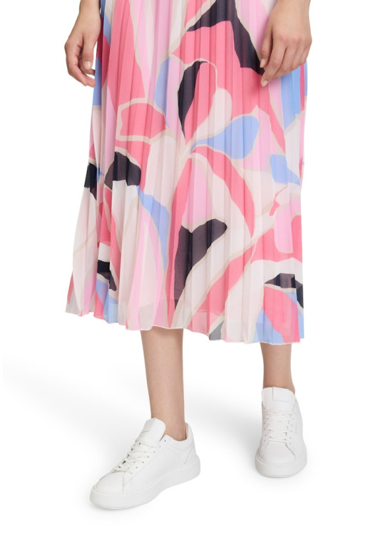 Přivolejte do svého šatníku pravou letní energii! Tato překrásná plisovaná sukně od značky Betty & Co vás okamžitě okouzlí svým výrazným abstraktním vzorem, který hraje pastelovými i sytými tóny růžové, modré a temně modré barvy. Její kouzlo spočívá v plynulém pohybu – jemné sklady lehkého materiálu při chůzi nádherně vlají a tvoří vysoce ženskou siluetu.