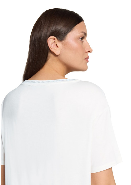 Všimněte si decentního lemování kolem kulatého výstřihu, které celku dodává jemnou strukturu. Volnější, splývavý střih s klasickým krátkým rukávem vám dopřeje absolutní svobodu, ať už se chystáte na nákupy do města nebo na pohodový oběd na terase. Je to kousek, který stačí obléknout k jednoduchým kalhotám.