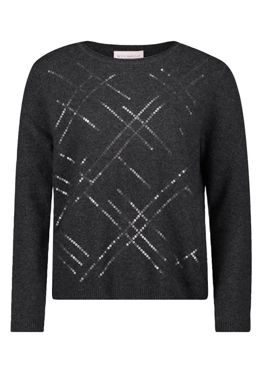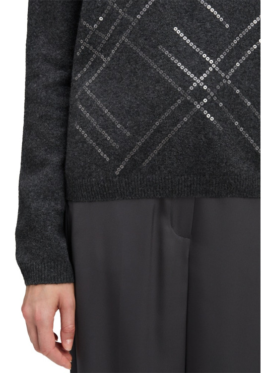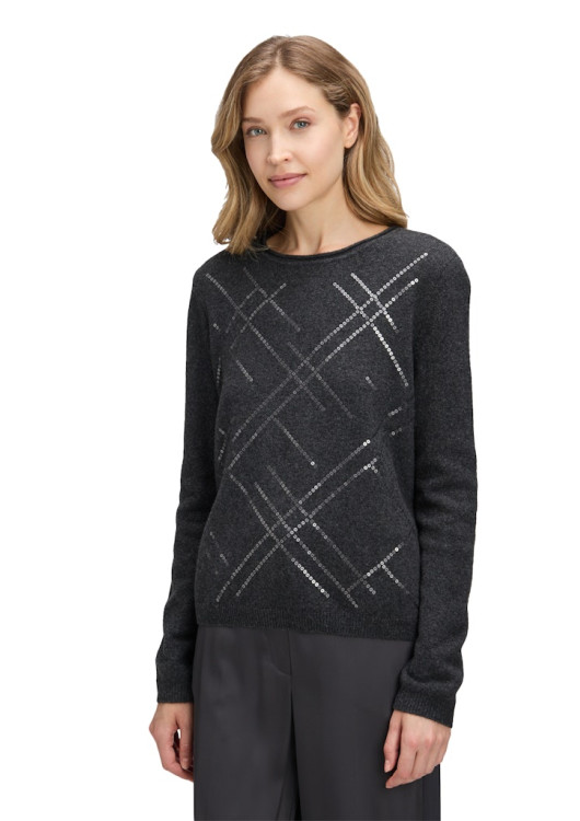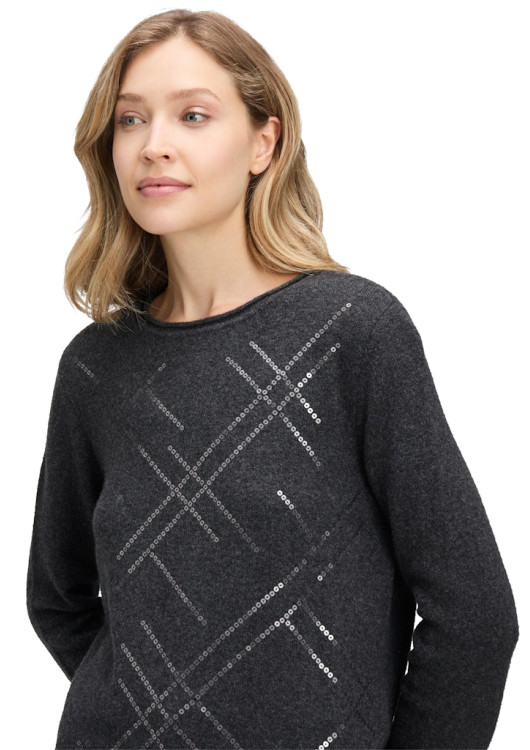 Tento jemně pletený svetr kombinuje stylovou eleganci s moderním designem. Moderní střih vytváří ženskou siluetu, zatímco grafické prvky a decentní flitry dodávají slavnostní nádech. Ideální pro zvláštní příležitosti s módním nádechem.