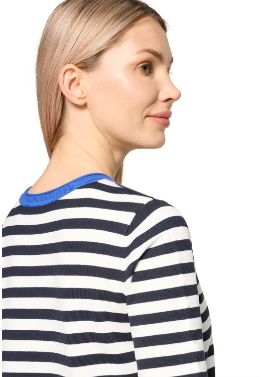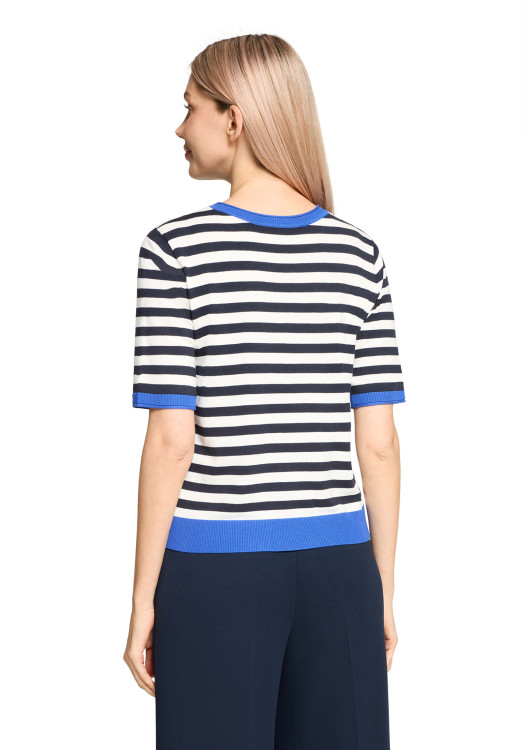 Úpletový svetr s krákými rukávy a kulatým výstřihem. Pruhovaný design dodává svetru ležérní nádech, ideální pro uvolněný, ležérní outfit v kombinaci s džínami.
