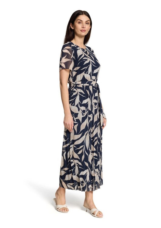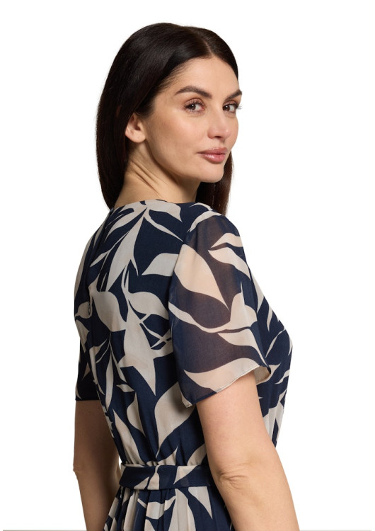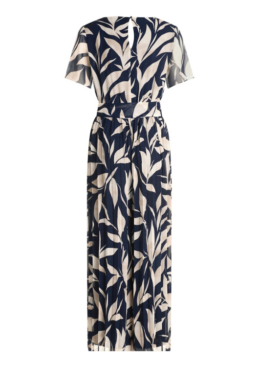 Tmavě modrý základ oživuje elegantní potisk s krémovými lístky, který působí velmi sofistikovaně. Horní díl má slušivý kulatý výstřih s drobným průstřihem a vzdušné, poloprůsvitné rukávky. Siluetu si navíc můžete sama vytvarovat pomocí látkového vázacího pásku, od kterého plynule splývají dolů precizně plisované nohavice. Díky nemačkavému materiálu budete vypadat naprosto bezchybně od první až do poslední minuty večera.