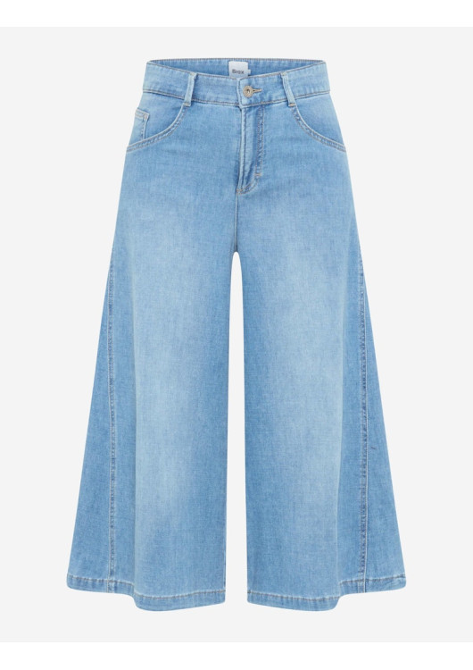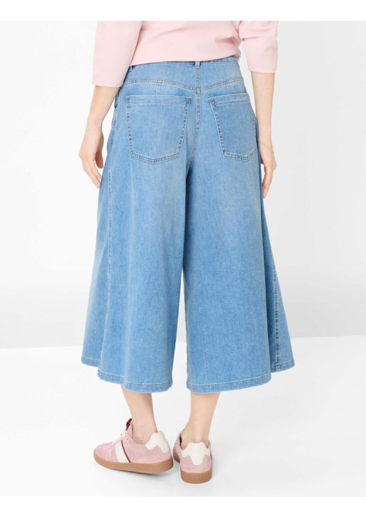 Trendy culottes kalhoty Melli ve stylu S jsou skutečným hitem a definují vysoce módní vzhled. Tyto osobité dámské džíny charakterizuje extra široká silueta s pravidelným pasem a zkrácený vnitřní šev typický pro culottes. Design je doplněn charakteristickými pěti kapsami, jako jsou boční kapsy, kapsa na mince, nakládané zadní kapsy a výrazné prošívání. Světlé praní dokonale zdůrazňuje letní, ležérní vzhled těchto dámských kalhot a umožňuje individuální stylingové možnosti. Kvalita je stejně působivá: ležérní denim potěší svým autentickým pocitem a odolností. Kombinace přírodní bavlny s inovativními strečovými vlákny zaručuje měkký pocit, volnost pohybu a spolehlivé zachování tvaru.
