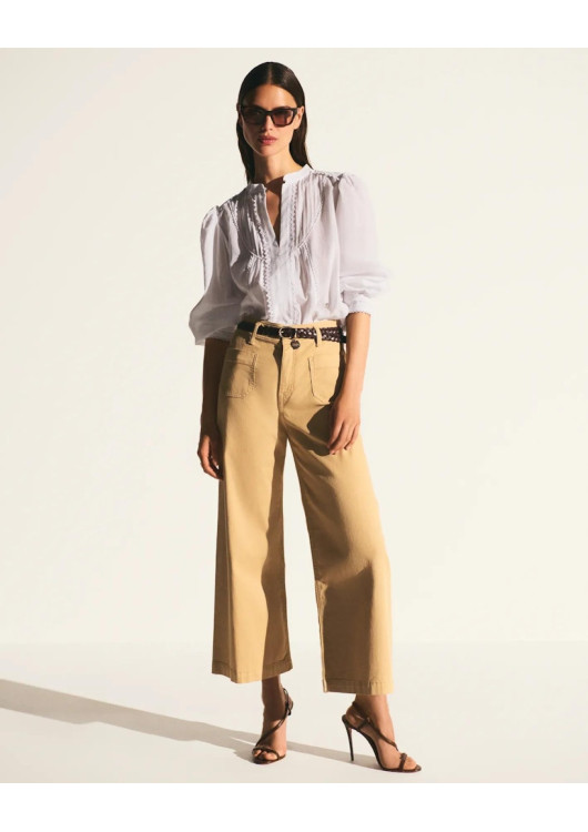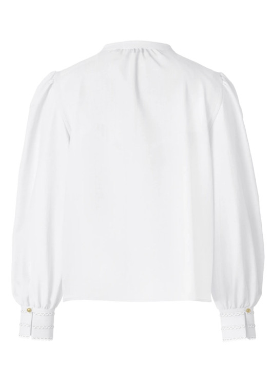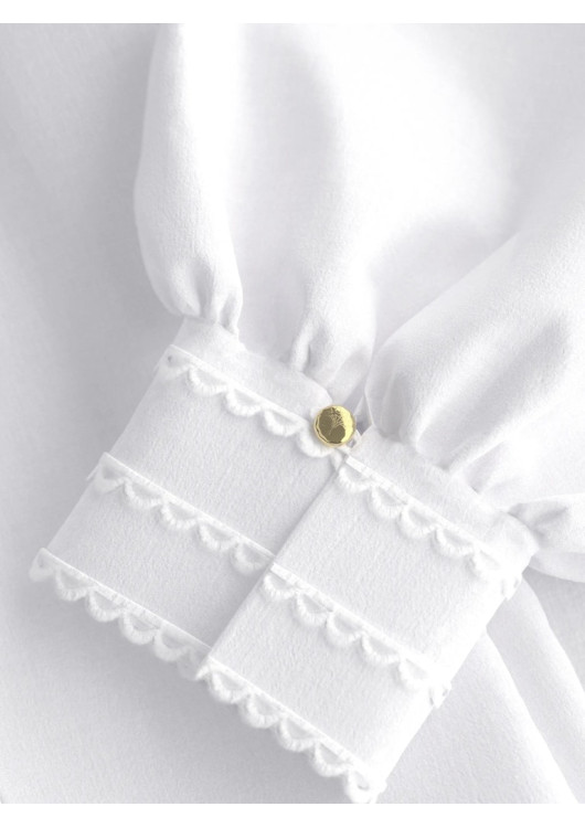 Halenka má malý stojáček se zapínáním na jeden výrazný zlatý knoflík, pod kterým se otevírá decentní výstřih. Romantickou siluetu dotvářejí dlouhé balónové rukávy, zakončené vysokými manžetami se třemi řadami krajky. Nechybí ani ikonická zlatá plaketka s logem.