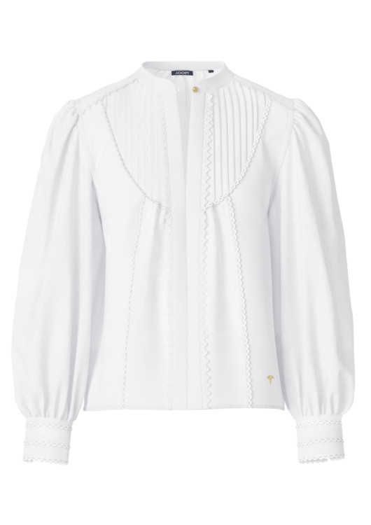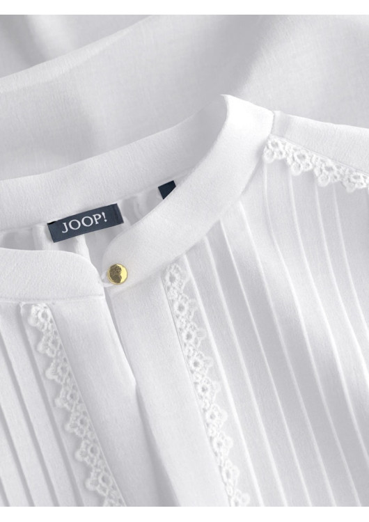 Podlehněte kouzlu detailů s touto exkluzivní halenkou od značky JOOP!. Design je inspirován boho-chic stylem, který je povýšen na novou úroveň elegance. Přední díl je bohatě zdoben svislým plisováním (puky) a vsadkami z jemné vyšívané krajky, které lemují i výstřih.