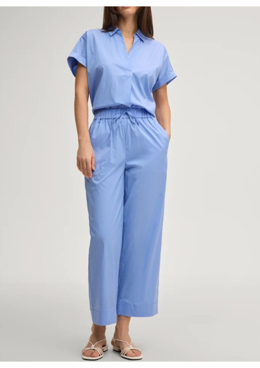 Vychutnejte si léto v naprostém pohodlí s těmito širokými kalhotami od značky JOOP!. Model sází na moderní "Wide Leg" střih a zkrácenou délku nad kotníky, což z nich dělá ideální kousek pro teplé dny. Jsou vyrobeny z lehké, hladké tkaniny, která je příjemná na těle a působí vzdušně.