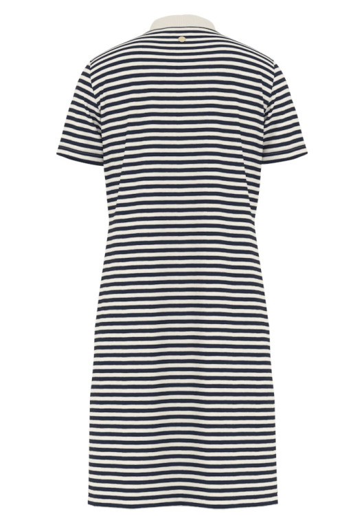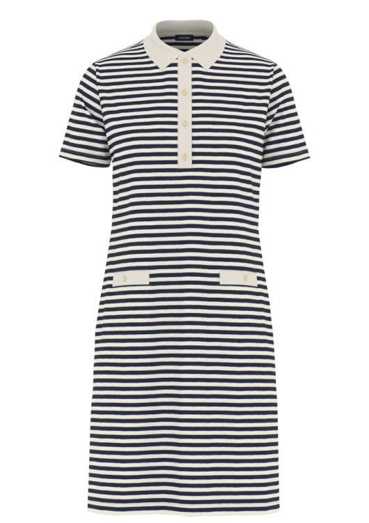 Dodejte svému šatníku špetku sofistikovanosti s těmito prémiovými šaty od značky JOOP!. Klasický střih inspirovaný polo tričkem je povýšen o ženský design a pečlivě vybrané detaily. Ikonický pruhovaný vzor v kombinaci tmavě modré a krémové barvy evokuje atmosféru Francouzské riviéry. Šaty mají strukturovaný polo límeček a légu se zapínáním na výrazné zlaté knoflíky s logem, které šatům dodávají punc luxusu. Dvě ozdobné lišty v oblasti boků (imitace kapes) opticky lichotí postavě. Díky kvalitnímu a příjemnému materiálu se v nich budete cítit pohodlně po celý den, ať už vyrazíte do kanceláře, na oběd s přáteli nebo na letní dovolenou.