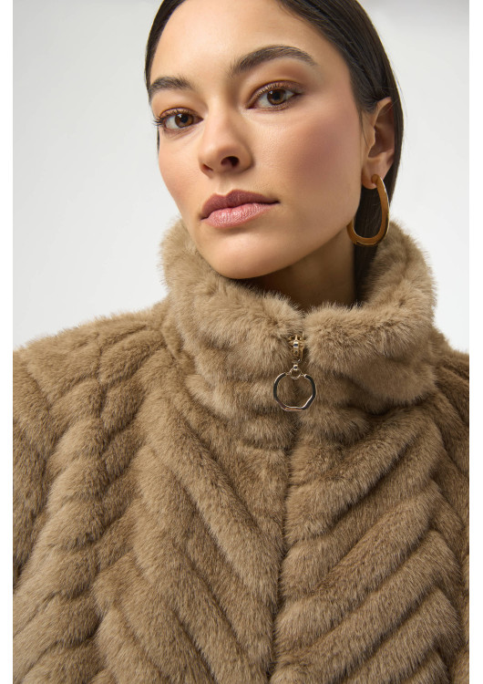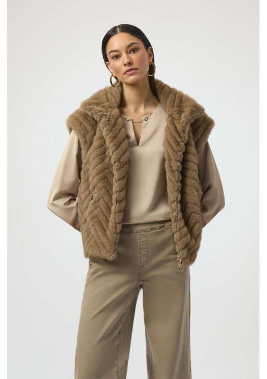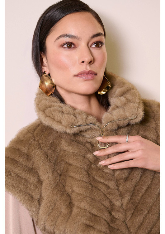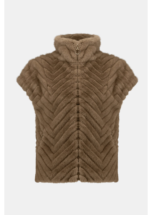 Vynikněte stylově s touto elegantní vestou z umělé kožešiny s výrazným chevronovým potiskem, který jí dodává odvážný, ale zároveň sofistikovaný nádech. S elegantním zapínáním na zip, krátkými rukávy a rafinovaným falešným výstřihem je to výrazný kousek, který jistě vylepší jakýkoli outfit.