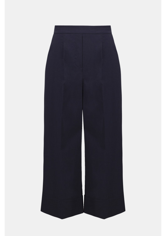 Hladký přední pas vytváří lichotivou siluetu a zplošťuje bříško, zatímco elastické řasení na zadní straně zaručuje, že vás kalhoty nebudou nikde tlačit ani po celodenním nošení. Široká manžeta na spodním lemu dodává kalhotám tu správnou váhu, aby krásně splývaly a držely svůj architektonický tvar. Je to univerzální kousek, který s lodičkami povýšíte na večerní róbu a s teniskami na luxusní městský outfit.