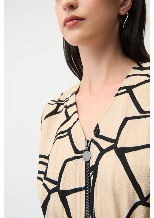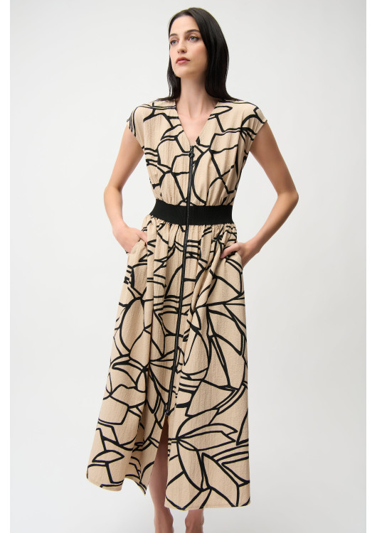 Připravte se na komplimenty. Tyto úchvatné šaty z dílny kanadského návrháře Josepha Ribkoffa jsou dokonalou volbou pro ženu, která miluje originalitu. Béžový podklad s černým abstraktním vzorem připomínajícím rozbité sklo nebo mozaiku působí umělecky a sofistikovaně.