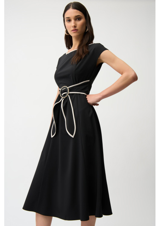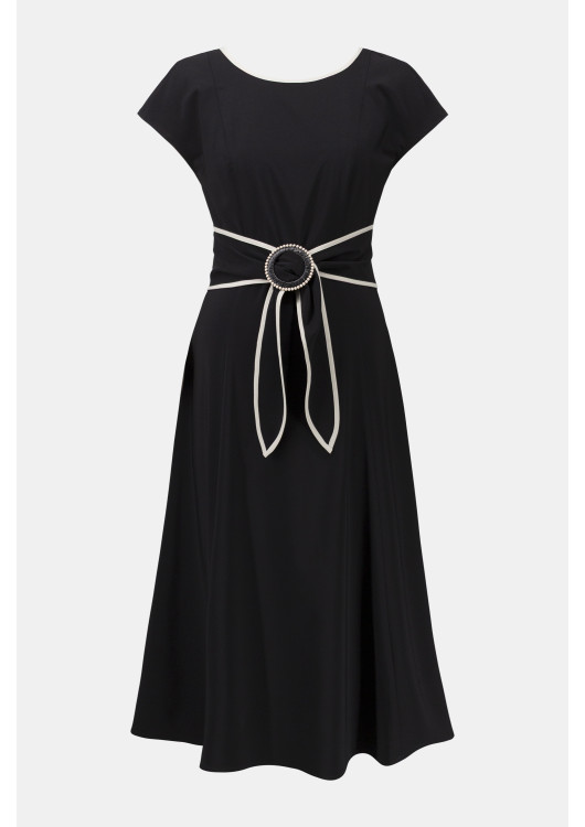 Hledáte šaty, ve kterých se budete cítit sebevědomě na obchodní schůzce i na slavnostní večeři? Tento model od Josepha Ribkoffa je dokonalou volbou. Klasická černá barva je oživena elegantním krémovým lemováním kolem výstřihu a v pase, což vytváří krásný kontrast a opticky zužuje siluetu.