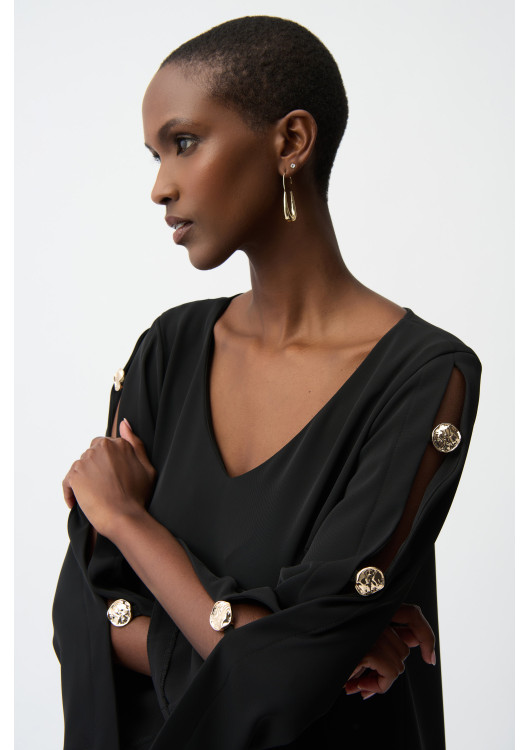 Představujeme Joseph Ribkoff – dokonalou kombinaci stylu a všestrannosti. Tyto volné šaty se vyznačují elegantními knoflíky a sofistikovaným výstřihem do V, takže jsou ideální pro formální, neformální i večerní příležitosti. Jednoduchý vzor a dlouhé zvonové rukávy dodávají šatům ženský nádech a zajišťují, že budete vypadat nenuceně šik a stylově.