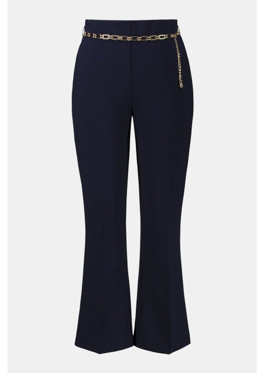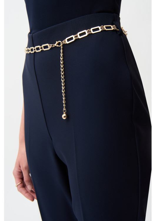 Hledáte kalhoty, které nepotřebují žádné další doplňky, aby zazářily? Tento model od návrháře Josepha Ribkoffa je šperkem sám o sobě. Elegantní tmavě modrou látku zdobí v pase výrazný zlatý řetízkový pásek, který dodává celému modelu punc luxusu a exkluzivity.