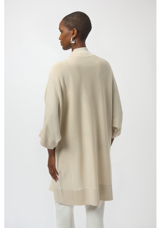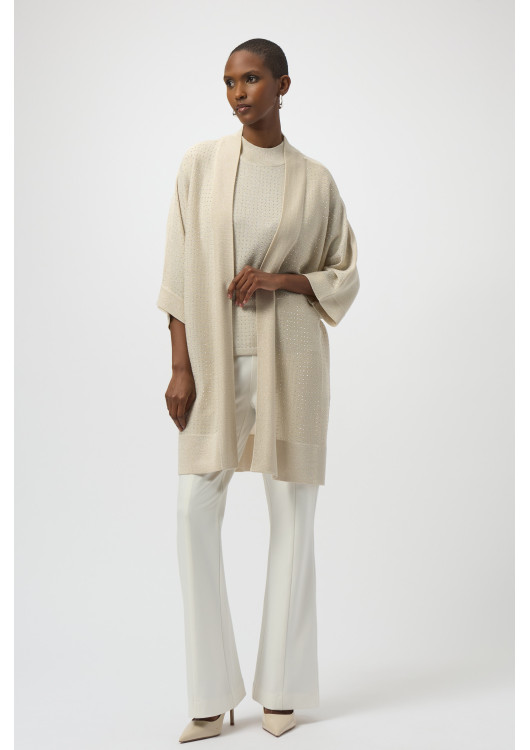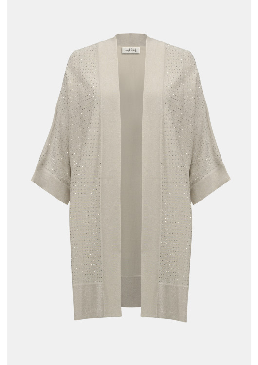 Tento elegantní přehoz je vyroben z měkkého svetrového úpletu a dodává mu okouzlující nádech s třpytivými nažehlovacími detaily vpředu. Jeho dlouhý, otevřený střih a rovná silueta vytvářejí ladný a splývavý vzhled, který je ideální pro každou příležitost.