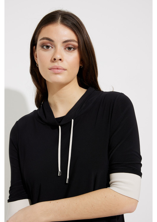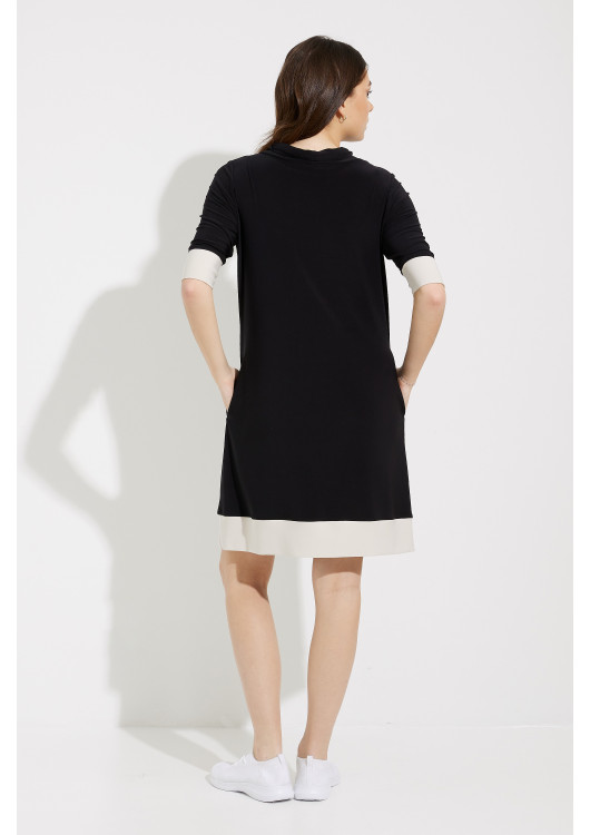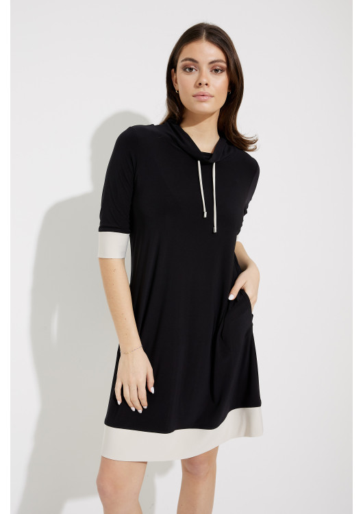 Tyto volnočasové šaty Joseph Ribkoff s pohodlným uvolněným střihem, výstřihem na šňůrku a nařaseným límcem jsou stylovou volbou pro víkendové výlety. Vyznačuje se výrazným kontrastním lemem kolem manžet a lemu – sportovní a přitom elegantní v jednom.