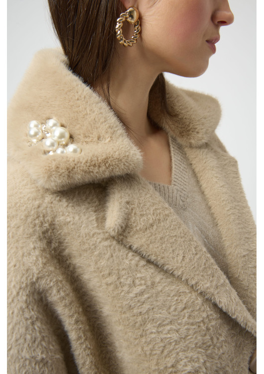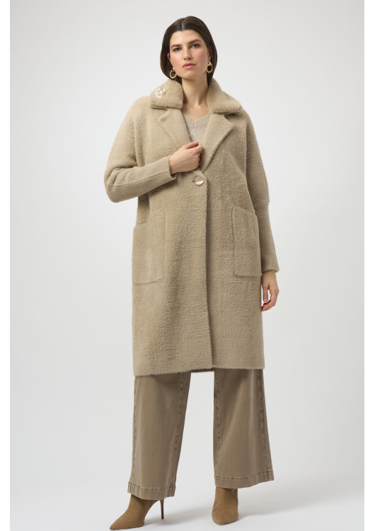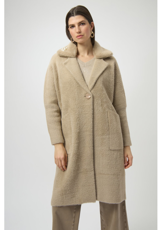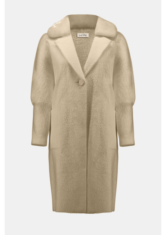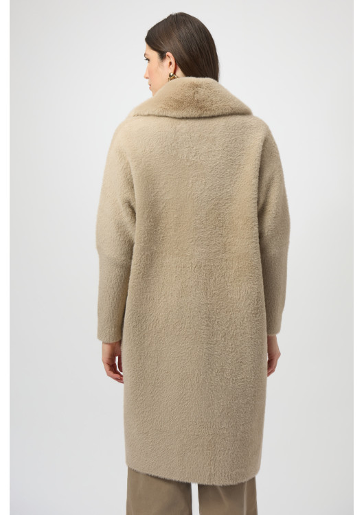 Odnímatelný límec a manžety z umělé kožešiny dodávají tomuto svetrovému kabátu opulentní nádech, zatímco vroubkovaný límec a nakládané kapsy mu dodávají nadčasovou sofistikovanost. Je vyroben z měkké péřové příze s krásně splývavou siluetou a je elegantní volbou pro chladnější dny.