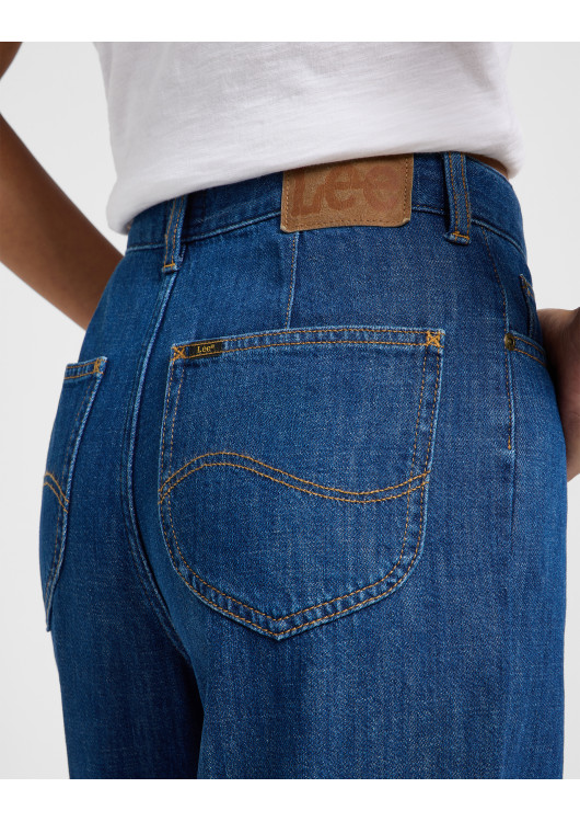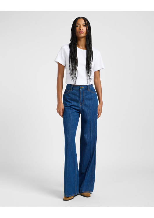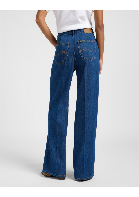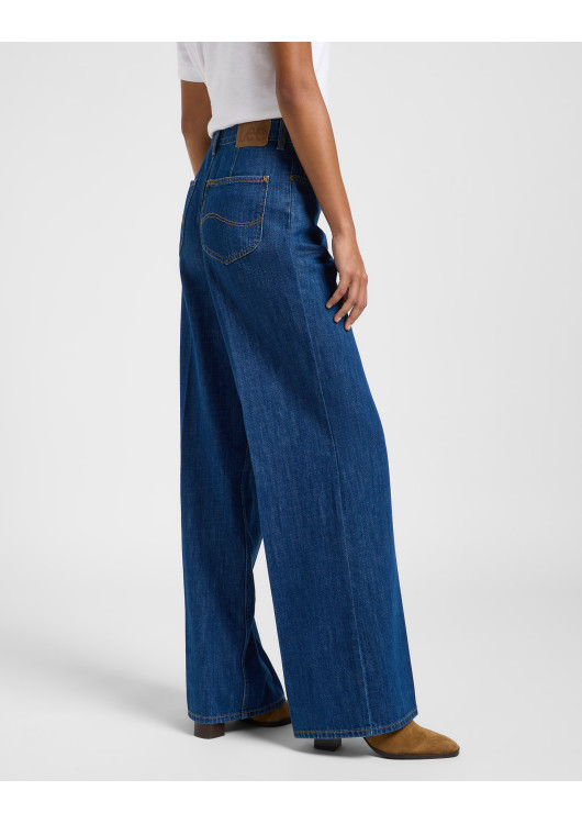 Tento střih v palazzo stylu se perfektně hodí k teniskám, kozačkám nebo vysokým podpatkům. Ultra vysoký pas vytváří lichotivou siluetu a je ideální pro zastrčení košile nebo nošení zkráceného trička. Lehká 280g látka je vyrobena z organické bavlny a nabízí vzhled a pocit autentického denimu bez tíže. Džíny mají nerovnoměrné tmavě modré praní s jemnými pruhy.