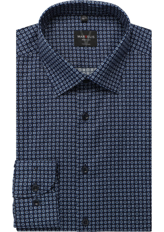Zažijte stylovou eleganci s košilí Marvelis Body Fit , jejíž přiléhavý střih dokonale zdůrazní vaši siluetu. Sofistikovaný tmavě modrý odstín s decentním potiskem dodá moderní nádech každému outfitu. Košile, vyrobená z vysoce kvalitního popelínu , nabízí pohodlí a hladký, snadno udržovatelný povrch.