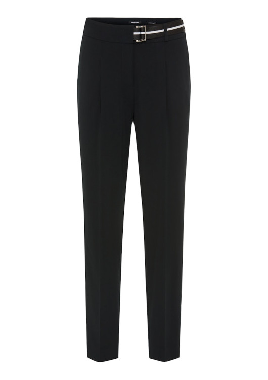 Hledáte kalhoty, které bez kompromisů spojují pravidla kancelářského dress codu se sportovní ležérností? Tyto černé kalhoty od značky Olsen se stanou vaším novým nejoblíbenějším kouskem. Jejich dominantou je bezesporu integrovaný sportovní pásek s černo-bílými pruhy a kovovou sponou, který klasickému designu dodává nečekanou originalitu a poutá pozornost k pasu.