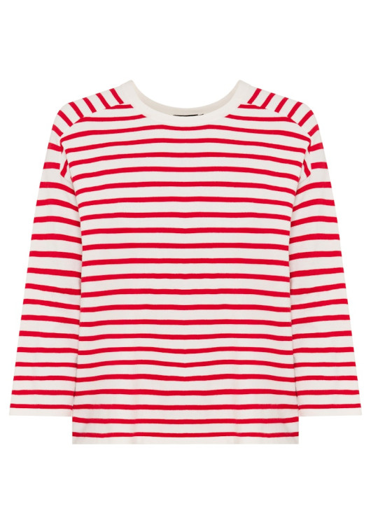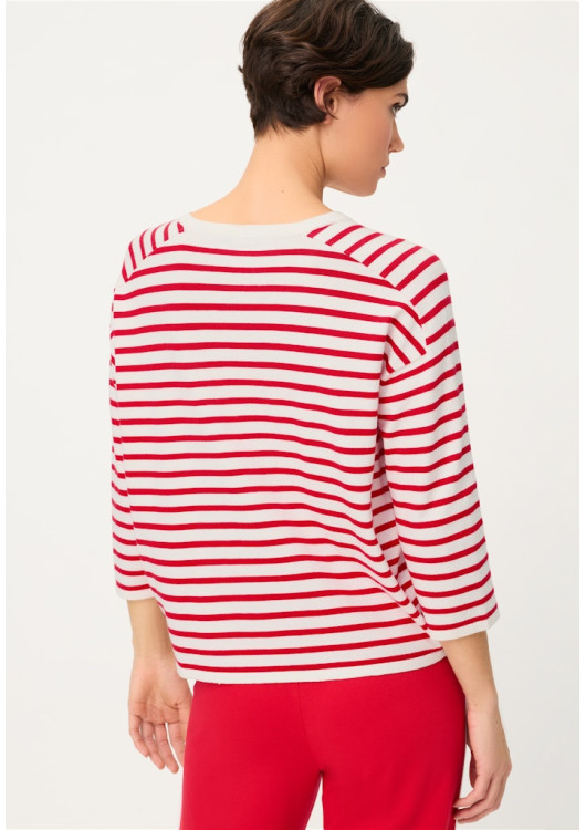 Klasický námořnický styl v moderním, energickém provedení. Tento jemný pulovr od značky Olsen z kolekce Riviera Mood je důkazem, že pruhy nikdy nevyjdou z módy. Kombinace svěží bílé a výrazné červené barvy okamžitě rozjasní váš outfit a dodá mu šmrnc francouzské riviéry.