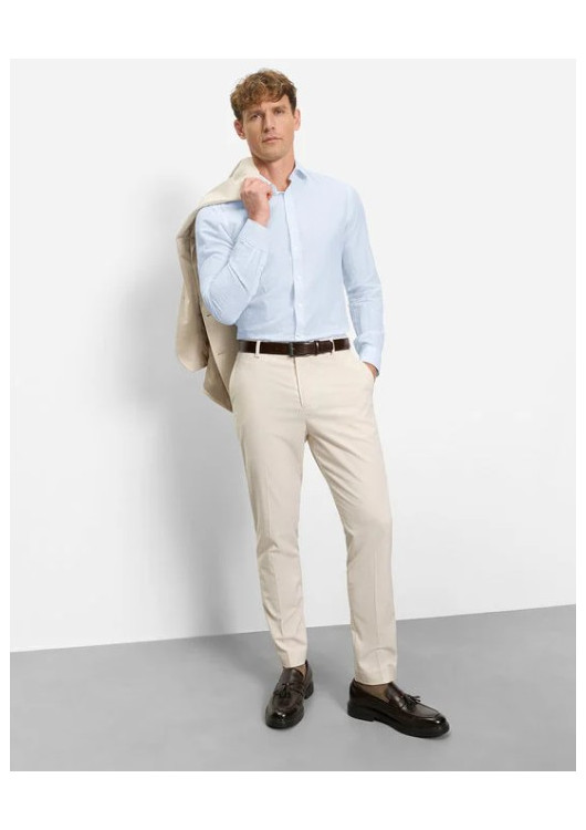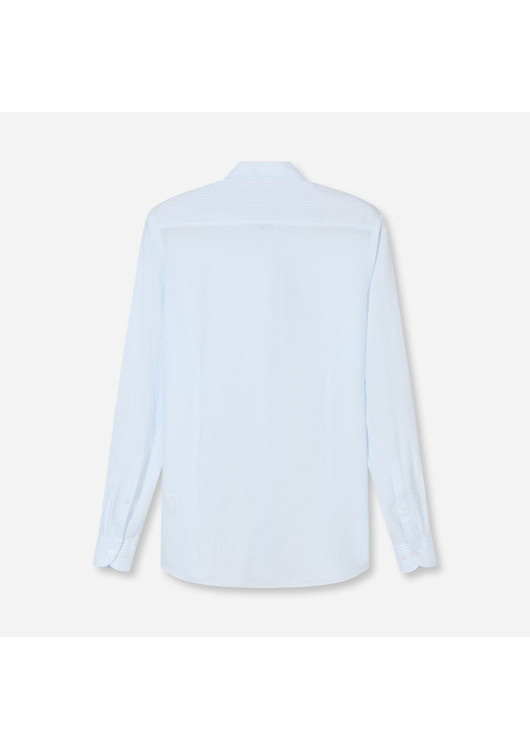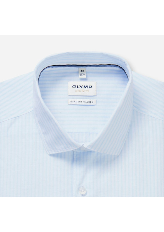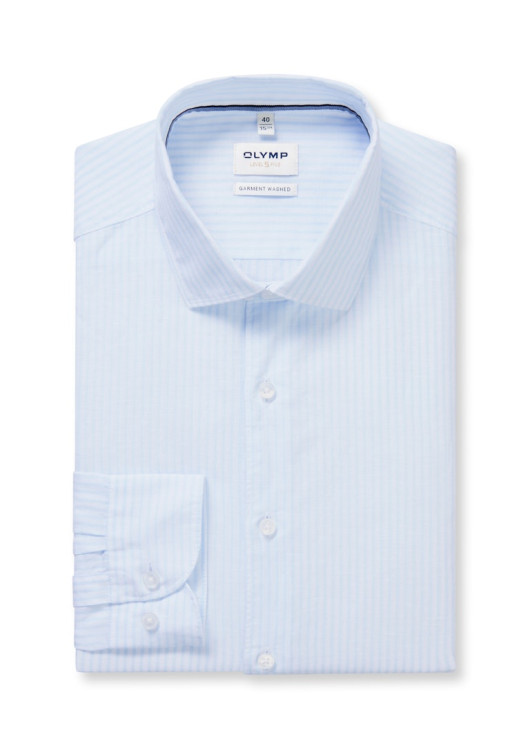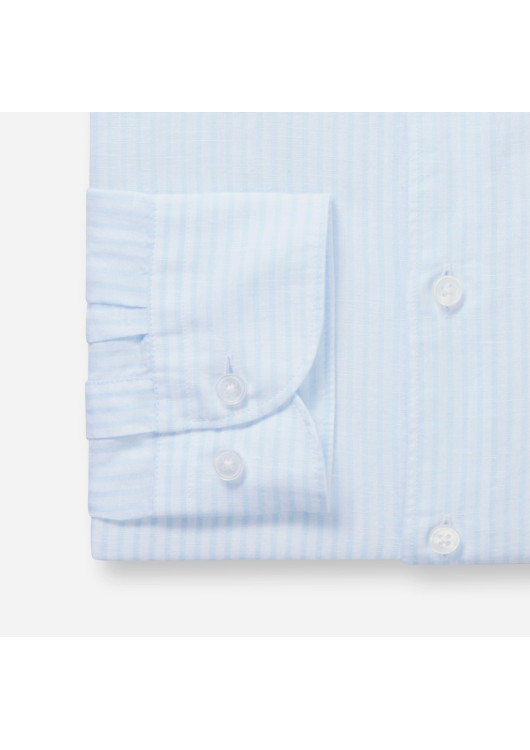 Košile OLYMP vyrobená z 57 % lnu a 43 % bavlny. Světle modré pruhy na bílé vytvářejí čistý vzhled. Body fit pro přiléhavý střih. Kentový límeček a knoflíková léga s bílými knoflíky. Hladká tkaná látka působí elegantně a zůstává spolehlivá i během náročného dne. 57% Len, 43% Bavlna.