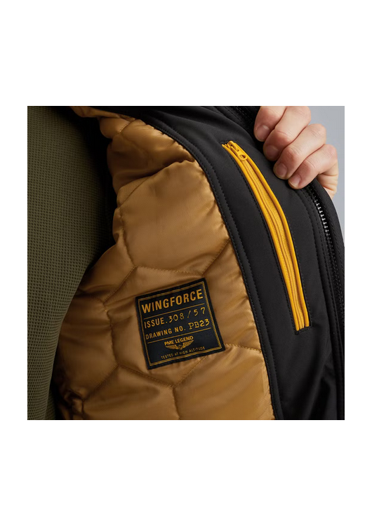 PME Legend Wingforce je inspirována skutečnou americkou klasikou: originální leteckou bundou B-3. Je vyrobena z funkčního softshellu se 4-směrným strečem. Technický materiál v kombinaci s ležérním vzhledem tuto položku odlišuje od sportovních bund. Odnímatelný límec z umělé kožešiny a lehká prošívaná podšívka. Několik nášivek zajišťuje autentický vzhled PME Legend.