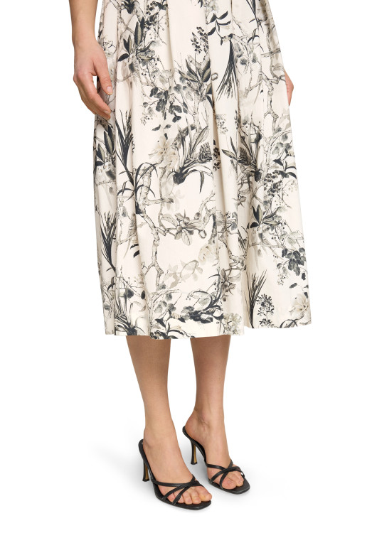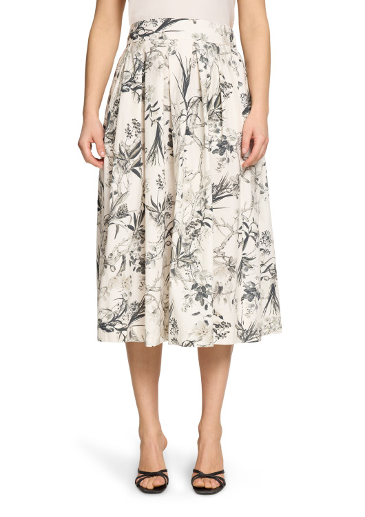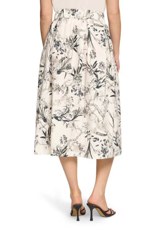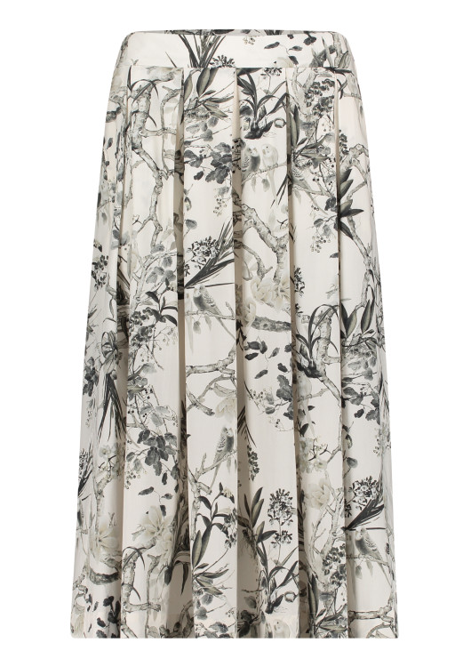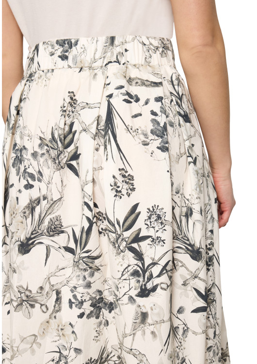 Hledáte kousek, který promění každý váš den v procházku zámeckou zahradou? Tato překrásná midi sukně od značky Robe Légere je uměleckým dílem, které do vašeho šatníku vnese nevídanou eleganci. Na smetanově bílém (off-white) základu se rozprostírá detailní, černosedý botanický potisk s motivem propletených větví a lístků, který připomíná luxusní francouzské vzory "Toile de Jouy".