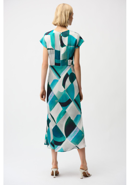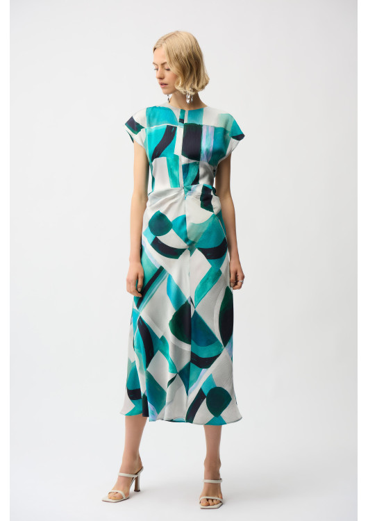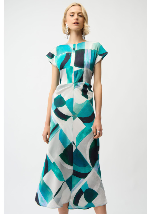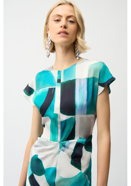 Oblečte se do elegance, která bere dech! Tyto okouzlující šaty od prestižní značky Joseph Ribkoff jsou navrženy pro ženy, které chtějí zazářit. Jejich hlavním trumfem je nepřehlédnutelný potisk kombinující abstraktní tvary a tahy štětcem v hlubokých, oceánských tónech tyrkysové a smaragdově zelené barvy.