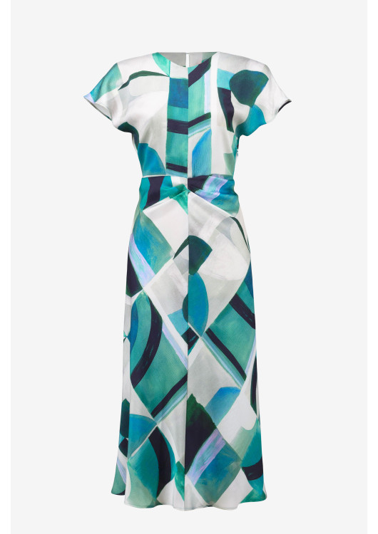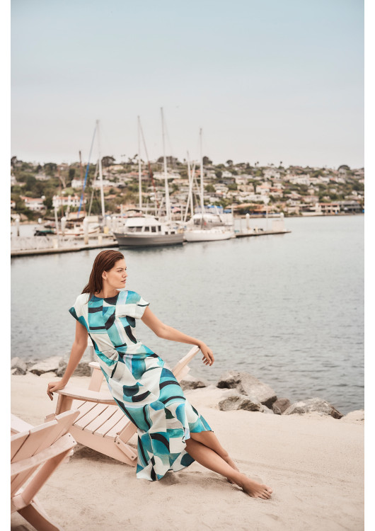 Návrháři této značky jsou proslulí tím, že dokonale rozumí ženskému tělu. Důkazem je rafinovaný detail centrálního uzlu a bohatého řasení v pase. Tento prvek fantasticky tvaruje siluetu, maskuje případné nedokonalosti v oblasti bříška a nechává sukni v midi délce volně a měkce splývat podél nohou. Uzavřenější lodičkový výstřih a jemně spadené rukávky dodávají šatům vysokou míru sofistikovanosti. Vzhledem k prémiovému, nemačkavému materiálu jsou to navíc ideální šaty na cesty, dovolené nebo dlouhé společenské události.