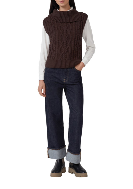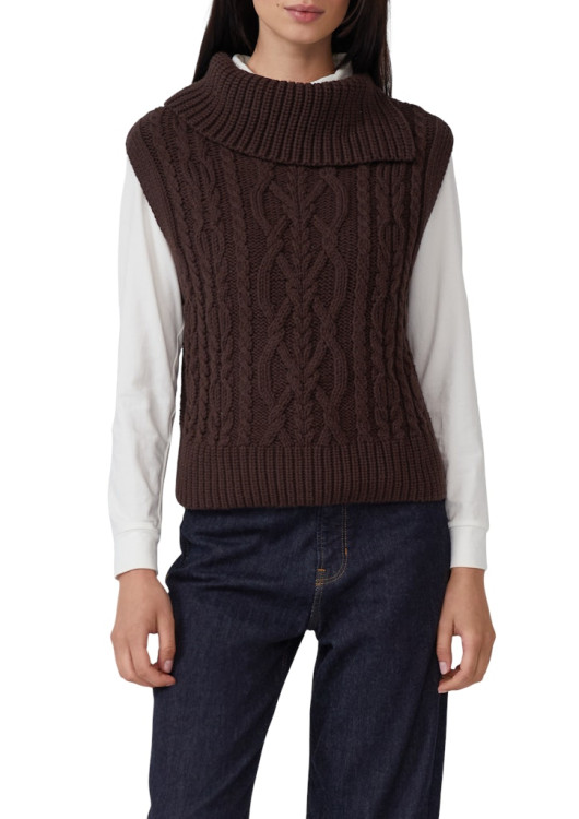 Pohodlná pletená vesta s copánkovým vzorem plným charakteru a elegantním rolákem. Měkký a pružný materiál vás zahřeje v chladných dnech. Běžný střih lichotí vaší siluetě a z tohoto ležérního kousku se stane perfektní společník.