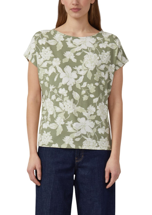 Vneste do svého šatníku svěží jarní vánek! Toto překrásné tričko od značky s.Oliver je dokonalým kouskem pro dny, kdy se chcete cítit žensky, elegantně, ale zároveň se nehodláte vzdát svého pohodlí. Na první pohled vás okouzlí jeho propracovaný botanický potisk s velkými, krémově bílými květy na uklidňujícím olivově zeleném pozadí.