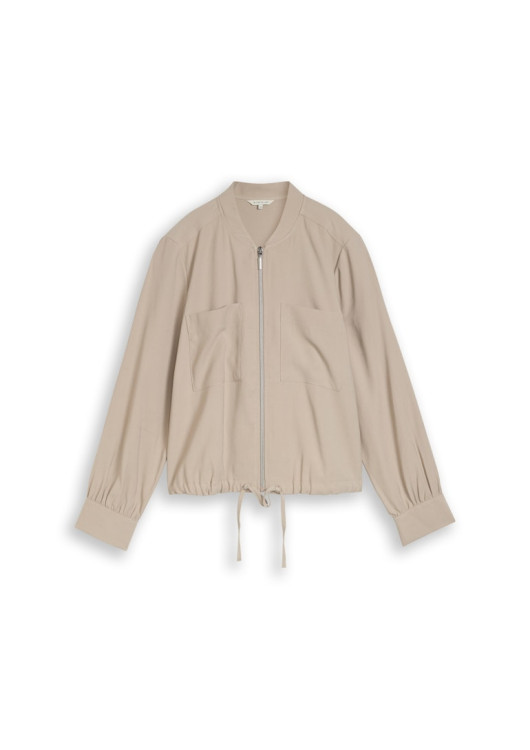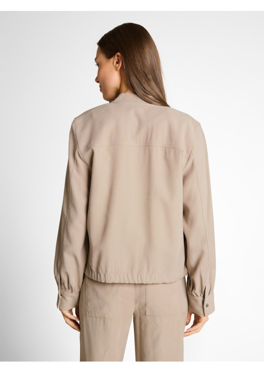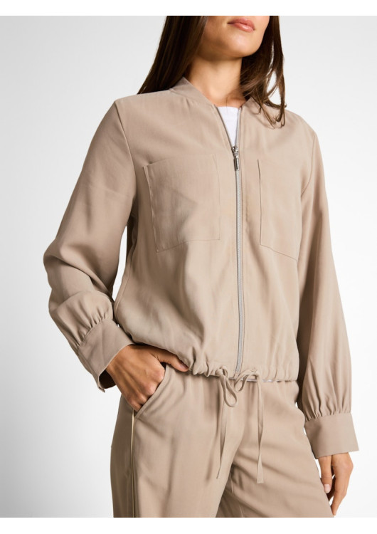 Bomberová bunda s nakládanými náprsními kapsami a mírně sníženými ramenními švy pro uvolněný střih. S lehkým nařasením a stahovací šňůrkou v lemu. Vyrobena ze splývavé viskózové látky. Můžete zkombinovat s kalhotami ze stejné látky, které najdete v naší nabídce.