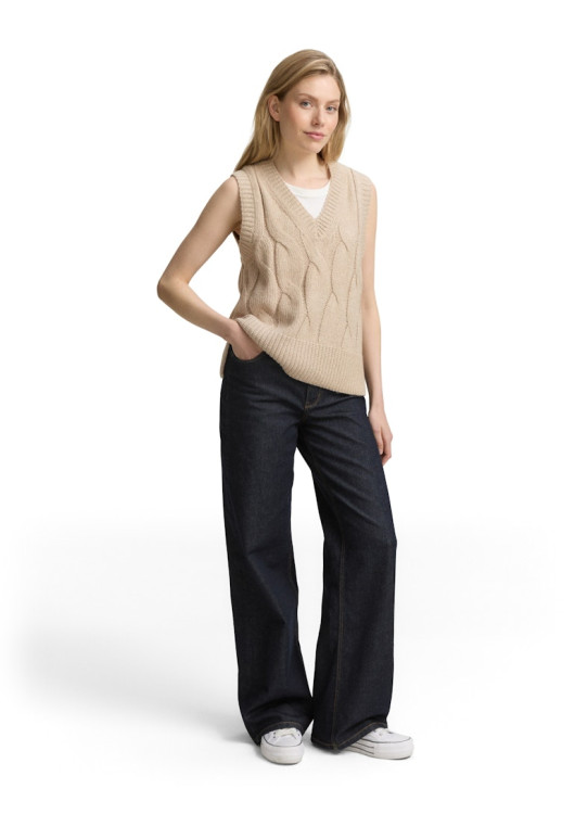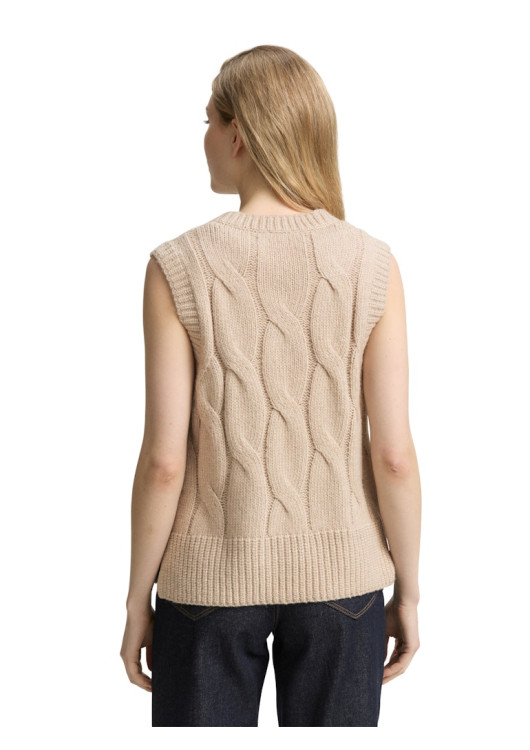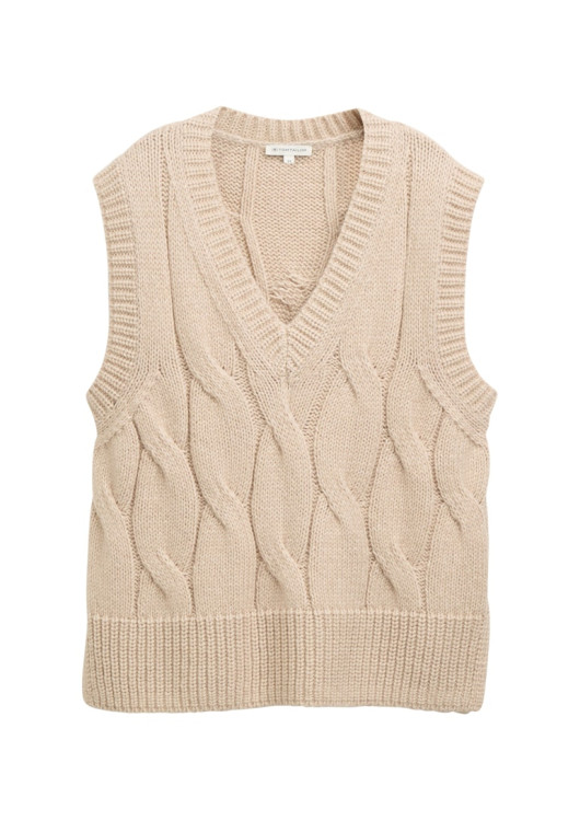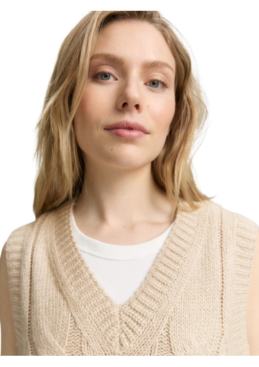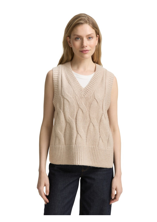 Tom Tailor dámská pletená vesta v melanžovém vzhledu s copánkovým vzorem a krátkými bočními rozparky. Vyrobena z měkkého pleteného materiálu s podílem vlny pro obzvláště hřejivý a útulný pocit.
