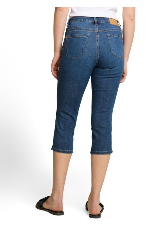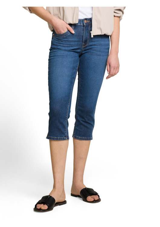 Capri džíny s krátkými bočními rozparky. Pětikapsový střih s bočními kapsami vpředu a nakládanými kapsami vzadu. Vysoký podíl streču zajišťuje větší volnost pohybu a pohodlné nošení.