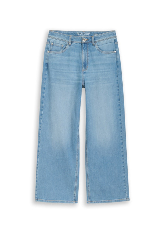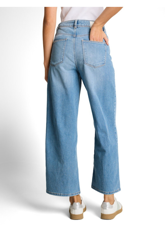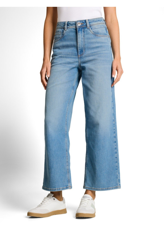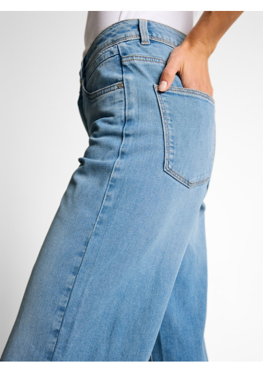 Džíny culotte s vysokým pasem a pěti kapsami, s bočními rozparkovými kapsami vpředu a nakládanými kapsami vzadu. Mírně strečový materiál zajišťuje větší volnost pohybu a pohodlné nošení.