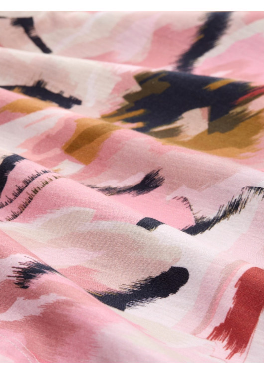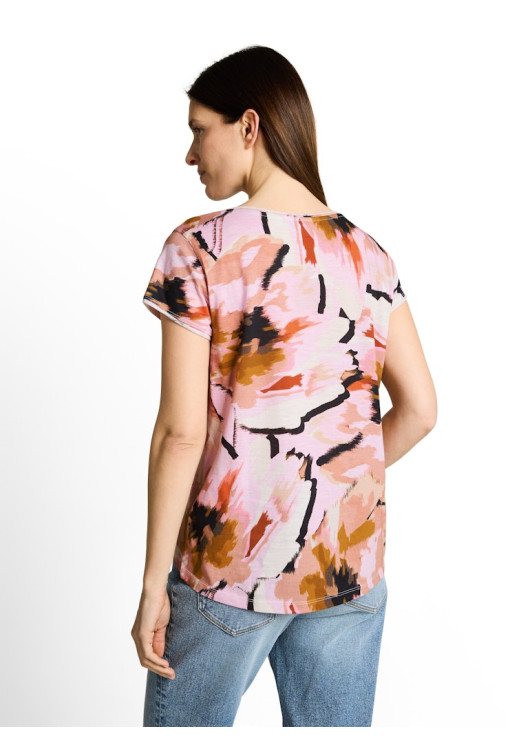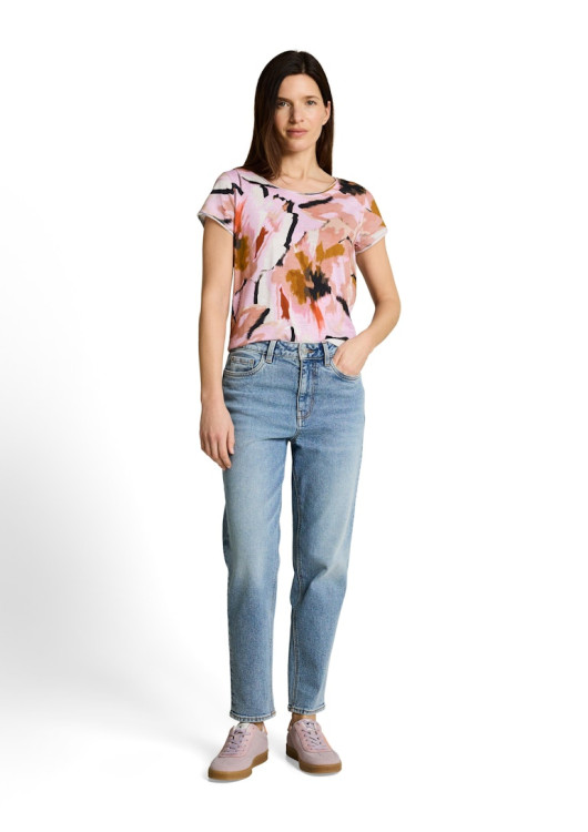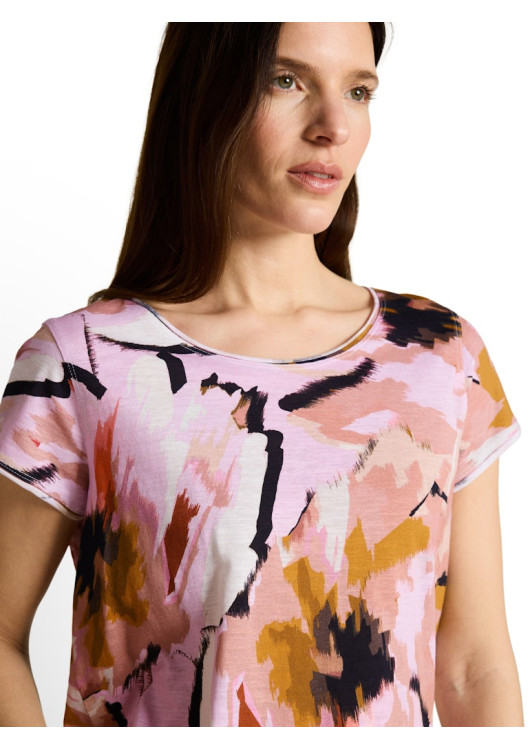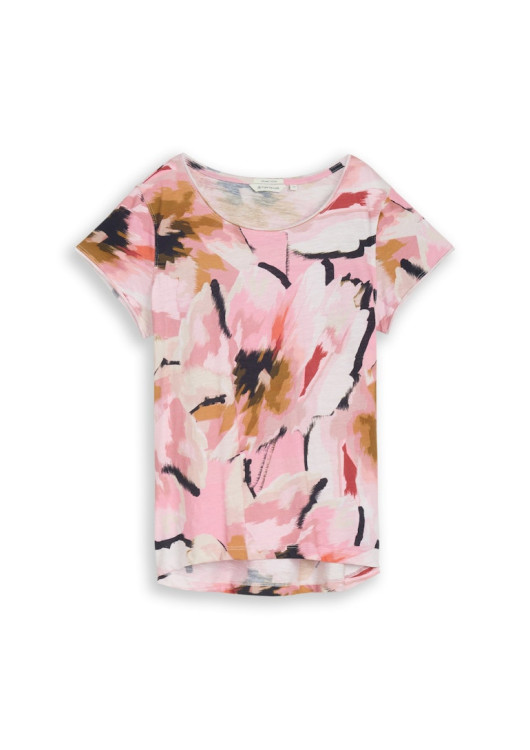Hledáte vršek, který okamžitě rozzáří váš den a dodá vám pocit výjimečnosti? Toto tričko od oblíbené značky Tom Tailor přináší do vašeho šatníku barvy letního západu slunce v moderním abstraktním pojetí. Širší kulatý výstřih a krátké přinechané rukávy vytvářejí uvolněnou siluetu, která působí nenuceně a velmi žensky.