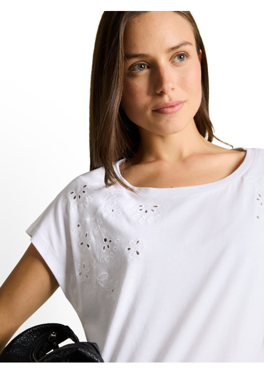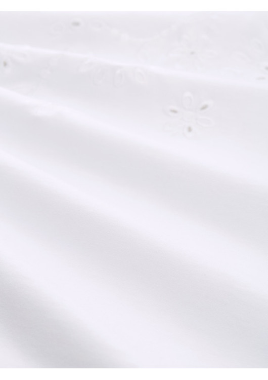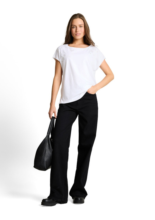 Hlavním designovým detailem je děrovaná výšivka s květinovými motivy, která tričku dodává hloubku a sofistikovaný ráz. Je to kousek stvořený pro ženu, která oceňuje čisté přírodní materiály – stoprocentní bavlna je prodyšná a velmi příjemná na dotek. Tričko, které s lehkostí propojí vaši přirozenou krásu s aktuálními trendy v duchu čistého minimalismu.