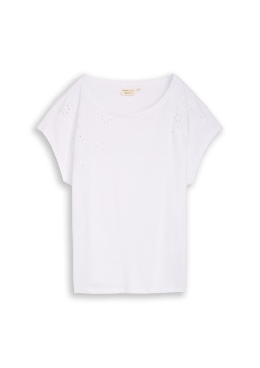 Hledáte vršek, který je stejně pohodlný jako vaše oblíbené tričko, ale vypadá o úroveň elegantněji? Tento top od oblíbené značky Tom Tailor přináší do vašeho šatníku čisté linie doplněné o půvabný detail výšivky. Volnější krabicová silueta s lodičkovým výstřihem a přinechanými rukávy vytváří moderní vzhled, který lichotí postavě a dodává outfitu nádech nenucené ženskosti.