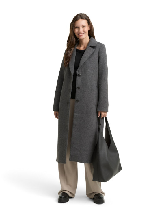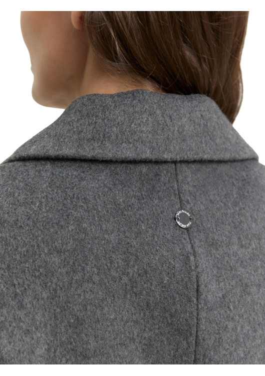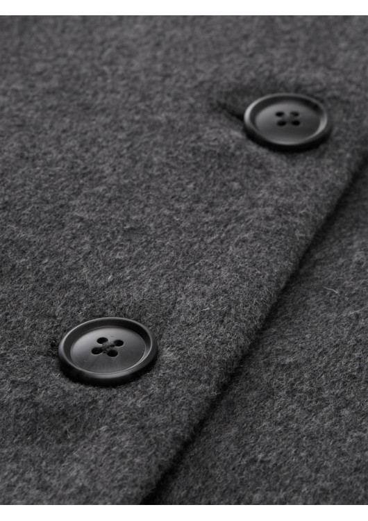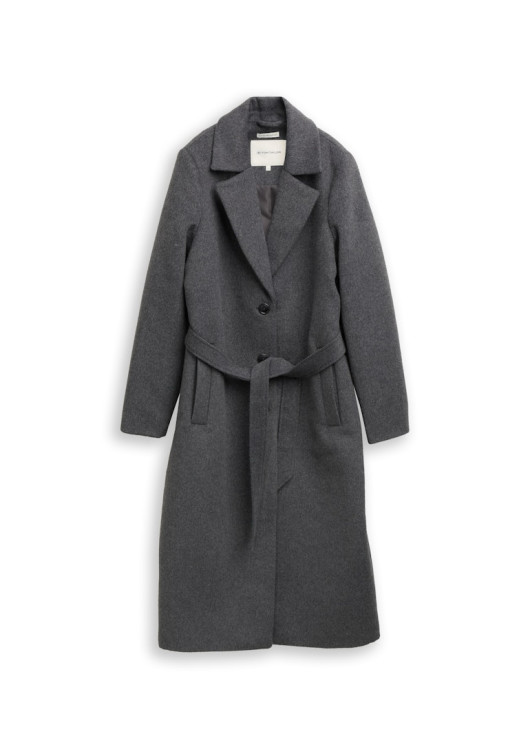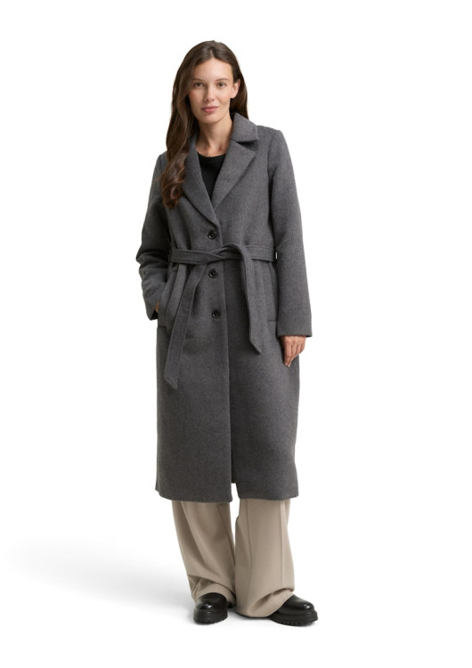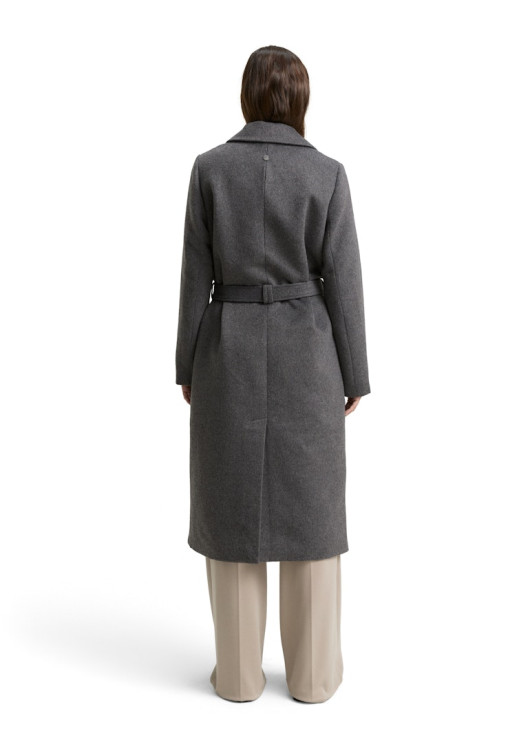 Klasický kabát s měkkým podílem vlny. S klopovým límcem, zapínáním na knoflíky a zavazovacím páskem. S bočními kapsami vpředu a další vnitřní kapsou. Krátký rozparek na zadním lemu pro větší volnost pohybu.