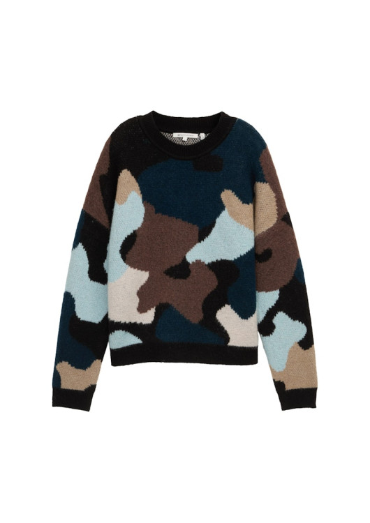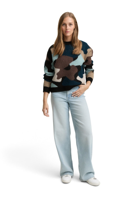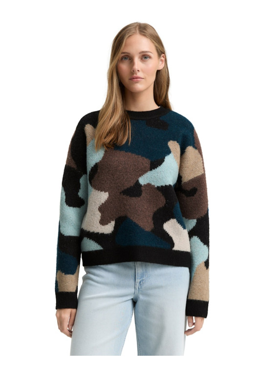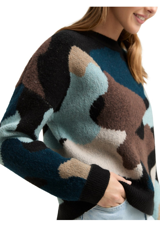 Tom Tailor dámský svetr s kulatým výstřihem, abstraktním vzorem a žebrovaným lemem. S mírně sníženými ramenními švy. Ve volném střihu.