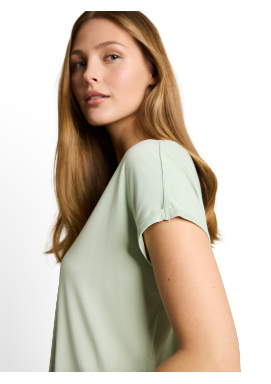 Tričko sází na uvolněný, mírně volnější střih, který nikde neobepíná a zaručuje naprostou svobodu. Širší kulatý výstřih krásně odhaluje klíční kosti, zatímco krátké rukávy zdobí stylový, fixně ohrnutý lem, jenž dodává celku ležérní šmrnc. Díky vysokému podílu prémiové viskózy vás látka potěší svým chladivým dotekem a elegantním, těžším spádem, který fantasticky lichotí siluetě.